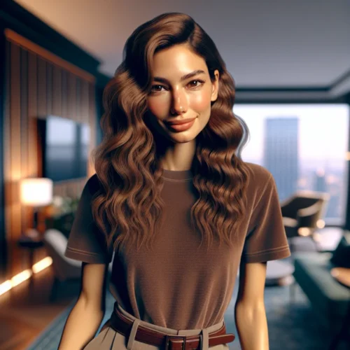 Benim hakkımda bilgi verecek olursam; ince yapılı ve hafif atletik bir vücuda sahibim. Uzun, dalgalı kestane rengi saçlarım ve büyük kahverengi gözlerimle dikkati çekiyorum. Üzerimde her zaman olduğu gibi şık bir tişört ve yüksek bel pantolon var.
